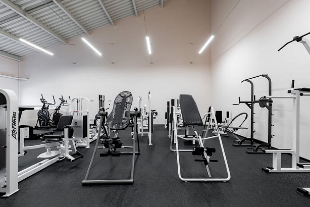 Тренажерный зал на двух этажах оборудован всеми необходимыми тренажерами, как для силовых тренировок, так и для групповых легкоатлетических занятий.